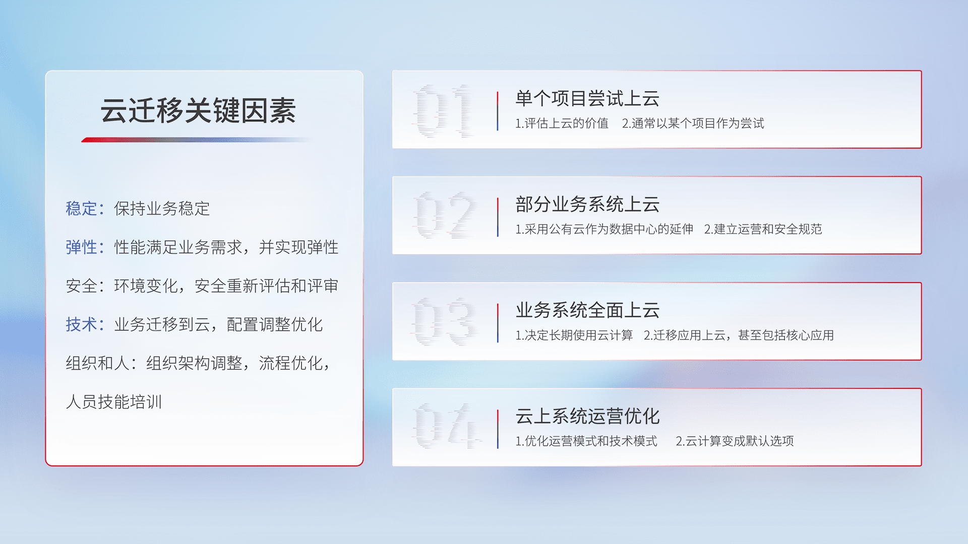 结合实际业务,,,,从规划设计、、、云平台选型、、云原生改造、、、、数据迁移、、、集成交付,,,迁移全过程为客户识别最佳上云路径,,,,做好风险识别管理,,,设计网络架构、、身份权限、、、安全审计合规、、、、操作审计、、、、日志审计、、监控告警策略、、、多站点容灾设计等,,,,对云上基础设施进行整体规划,,提升IT治理水平,,,以满足弹性、、、高可用、、、高性能的需求。。