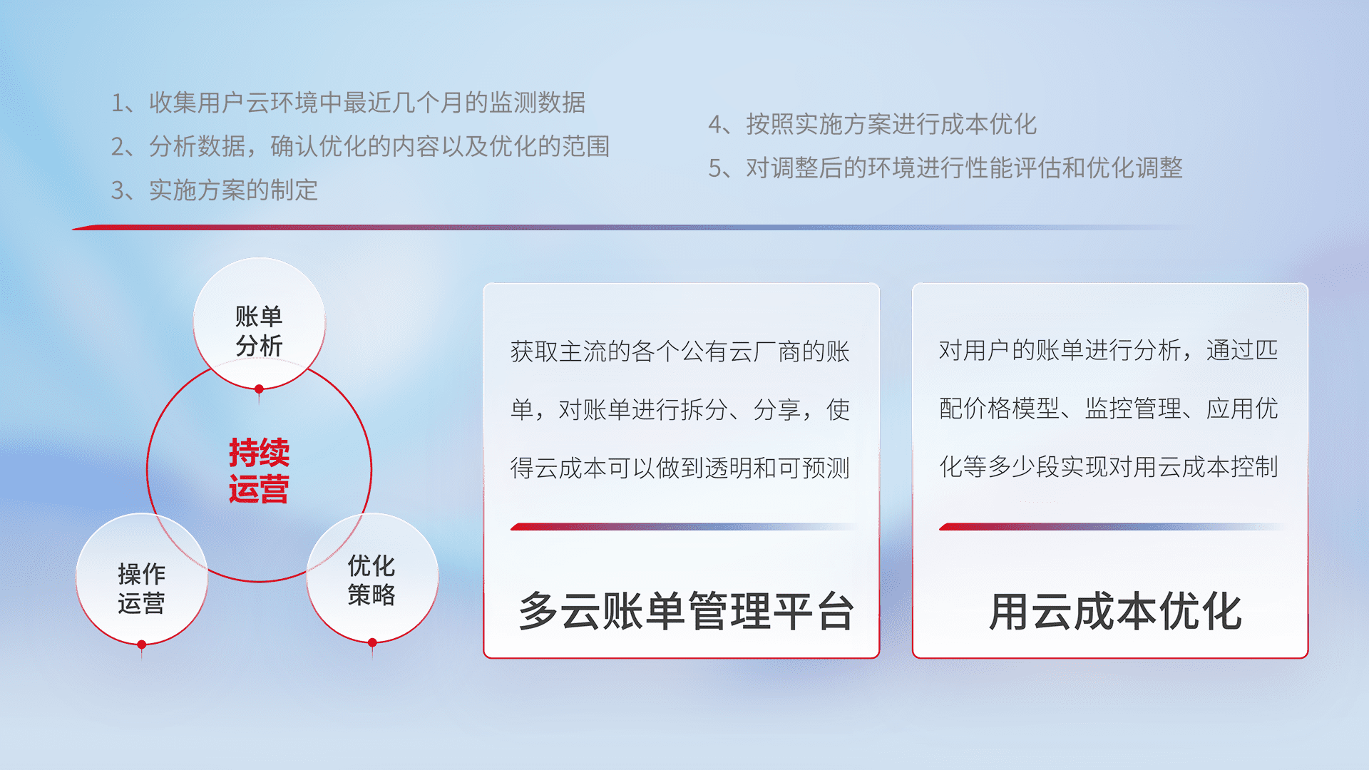 通过多云纳管,,,以统一的资源数据模型把客户的云资源进行抽象和封装,,进而实现对多云资源的统一操作,,,,保障云资源管理的可靠性、、、、稳定性与可用性。。。量身定制化运维内容,,,,配置、、、、开发运维、、、补丁管理、、、、备份、、监控、、、认证和访问管理、、审计和日常巡检等,,保障在用云过程中的可靠度,,,,稳定度以及高可用率。。。